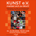 06.11.2024: KUNST e.V. lädt Göttinger Bürgerinnen und Bürger ein zu einer öffentlichen Informationsveranstaltung zur Lage der Kultureinrichtungen und Initiativen nach Bekanntgabe des Haushaltsentwurfs 2025-26 am Dienstag, 24.9. um 19 Uhr im Deutschen Theater Göttingen (dt.1)