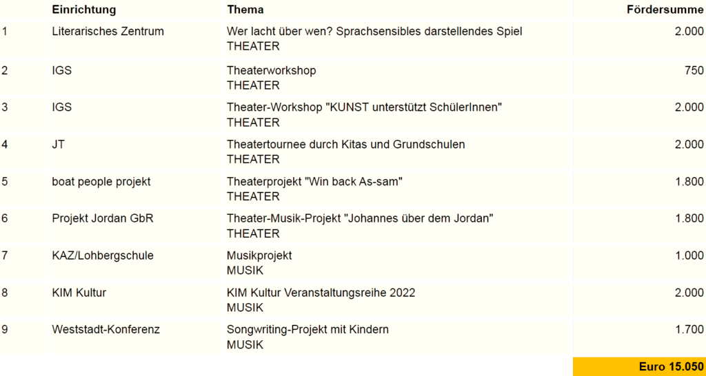 Mit den letzten 15.000 Euro des Spendentopfes wurden nun noch 9 Theater- und Musikprojekte – ausgewählt von einer Jury – für eine Förderung ausgewählt. Allein 6 der Projekte finden an Göttinger Schulen statt oder sind für Kinder gedacht, wie der Auflistung der Projekte zu entnehmen ist.