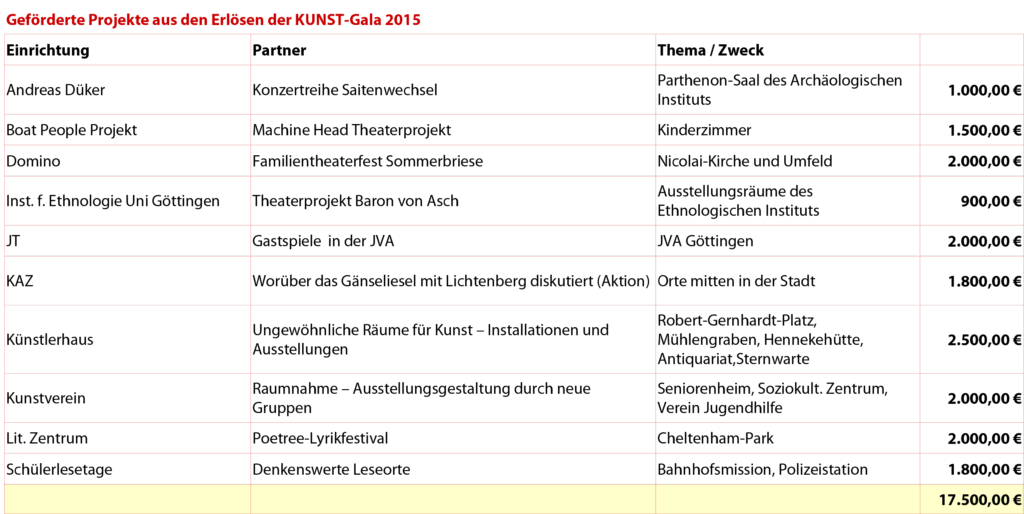 Die Einrichtungen konnten bis Ende Feb. 2015 ihre Anträge beim Verein einreichen. Im März tagte eine ausgewählte Jury, die über insgesamt 13 Anträge mit einer Gesamthöhe von fast 70.000 Euro, davon 22.000 Euro bei KUNST beantragt, zu entscheiden hatte. Die Jury entschied, 10 Projekte ganz oder teilweise zu fördern.