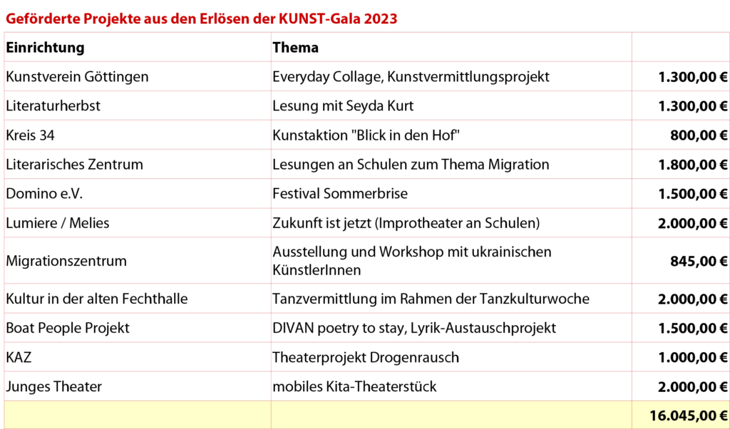Insgesamt wurden 14 Anträge eingereicht, in denen 21.745 Euro beim Verein KUNST beantragt waren. Die Jury des Vereins KUNST, die am 4.4.23 über die Vergabe der Fördergelder zu entscheiden hatte, hat die Anträge eingehend geprüft. Der Erlös der KUNST-Gala 2023 betrug 16.000 Euro, die maximal als Fördergelder vergeben werden konnten. Die Jury hat entschieden, 7 Projekte voll und 4 teilweise zu fördern. 3 Projekte konnten leider nicht gefördert werden.